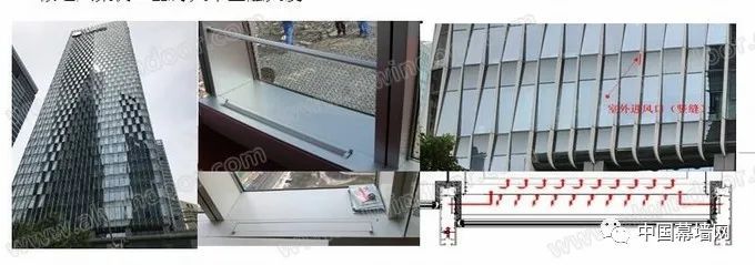 上海越洋广场,根据办公楼主要运行于白天而夜间处于低负荷运行特点,与本建筑HVAC(暖通空调)设计结合,采用低成本内循环双层幕墙,达到节能及舒适目的。