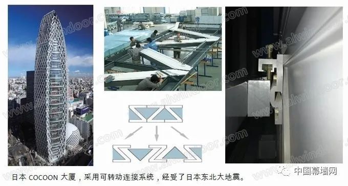 单元幕墙按构造,主要分为三种形式。对碰式独立单元和采用横锁或横滑式的互相插接单元。北京中纺大厦采用了横锁式单元幕墙,其优点是防水性和气密性优良,虽然平面内变位吸收能力比横滑单元略低一些,但也能达到建筑平面内变位L/150 以上的要求。所以横锁单元幕墙完全满足钢结构主体在内的各种结构建筑对其幕墙的抗震和平面内变位性能要求。由于横锁单元幕墙构造设计、加工复杂性和施工精度要求相对较高,实际工程中应用相对很少。相比之下,在国内建筑幕墙市场上横滑单元幕墙应用比较普遍。至于独立式单元幕墙,由于其水密性能对施工缺陷敏感,施工误差吸收能力也较弱,在国内实际工程中应用极少,在欧洲市场上应用比较普遍。