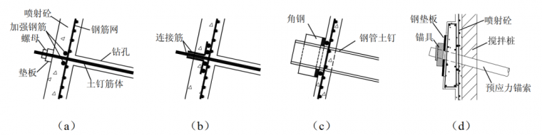土钉靠群体作用,构造中通常在土钉之间设置连接筋,通称加强筋。加强筋的作用大体有 4 点:①能更好地协调土钉共同工作;②稳定钢筋网片;③分散钉头对面层的局部压力,防止局部压剪破坏;④增加混凝土的延展性,防止钉头下混凝土发生冲切破坏。工程中通常在水平方向设置加强筋。国内早期工程中也有在竖向上设置加强筋的作法,施工不便,效果不好,目前已很少采用。加强钢筋一般采用 16~25 的 3 级带肋钢筋,通常设置 2 根,重要部位设置 4 根,与钉头焊接。