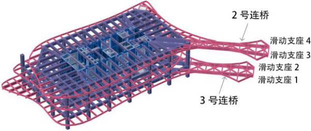4)当连接体承载力较小时,可根据极限荷载分析结果确定支座和阻尼器参数,减小连接体内力,并进行整体建模分析验证,确保连接体和主体结构安全可靠。