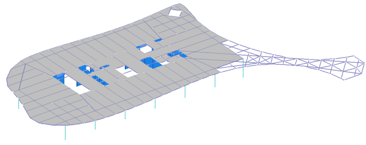 选取跨度最大的上层连桥进行分析,考虑在中、大震时连接体楼板可能开裂失效,在分析中偏安全的取消了混凝土楼板,仅将楼板自重作为荷载施加在连接体上进行分析。由于分析的目的是得到连接体的极限承载力,计算模型仅取连接体和与连接体相连的楼层进行分析。SAUSAGE计算模型如图3所示。