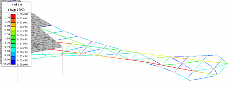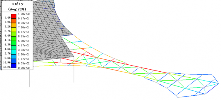 图12 轴向水平加载极限荷载时刻钢材应变与屈服应变比值云图