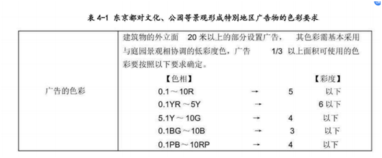 东京都对文化、公园等景观形成特色地区广告物的色彩要求建筑物的外立面20米以上 的部分设賢广告 其色彩需基本采用与庭园景观相协调的低彩度色,广告1/3以上面积可使用的色彩要按照以下要求确定。