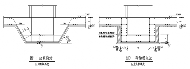 地下室底板降标高的做法应具体问题具体分析,不能一概而论。天然地基和复合地基应采用开挖放坡、底板放坡的方式。桩基础应根据实际情况选用砖胎模、开挖放坡+垫层放坡、开挖放坡+底板放坡等做法。