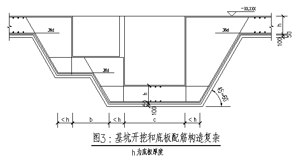 放坡是最常用的做法,对地基土的扰动较小,能较好地保持地基土的原始应力状态。但当变标高部位相距较近、高差较大时,尤其是消防电梯集水坑,深度至少在3米以上,放坡的工程量较大,挖坑的形状、底板配筋构造、防水层构造等均较复杂(如图3)。