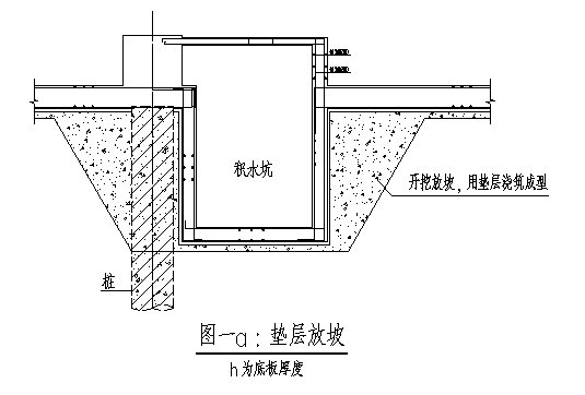 软弱土局部深挖,将对临近的桩产生侧压力,严重时还会引起桩的偏斜甚至断裂。所以桩周浅层为软弱土时,开挖时应放坡。此时的地下室底板有两种做法,一是底板放坡(如图一);二是底板直立、垫层放坡(如图一a)。垫层放坡需要在浇筑垫层和浇筑底板时各支一次模。底板放坡只需支一次模,但桩顶标高的控制、桩头的处理均较复杂。而且,底板放坡造成桩头与底板的斜面连接,如图一所示。这种连接方式需要妥善处理,否则会有隐患,见下文。