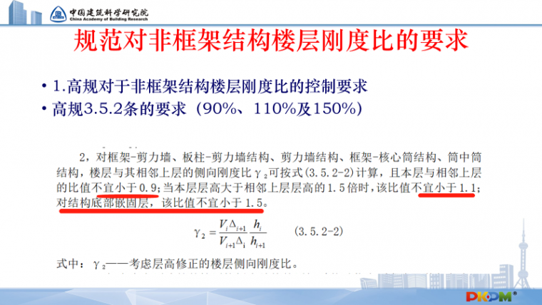 抗规对于非框架结构刚度比的计算是按照层间剪力与层间位移计算的结果,并且对限值的要求是满足本层刚度不小于上层的70%及上三层平均值80%的比值。高规对于非框架结构刚度比则做出了其他的规定,要求按层间剪力与层间位移计算的刚度比,考虑层高不同的影响,对限值的要求按照90%、110%或150%控制。
