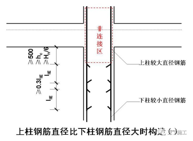8、抗震框架结构上层柱内钢筋比下层柱内钢筋直径大时,上层钢筋的最短切断点在梁底向下延伸的长度不少于llE+( Hn/6、hc、500mm中的较大值 ),其它符合钢筋连接的质量要求。