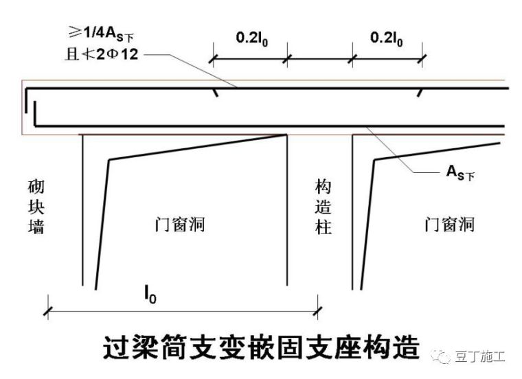 10、当梁端实际受到部分约束但按简支计算时,应在支座区上部设置纵向构造钢筋,其截面面积不应小于梁跨中下部纵向受力钢筋计算所需截面面积的1/4,且不宜少于2Ф12的钢筋,该纵向钢筋构造自支座边缘向跨内伸出的长度不应小于0.2lo。