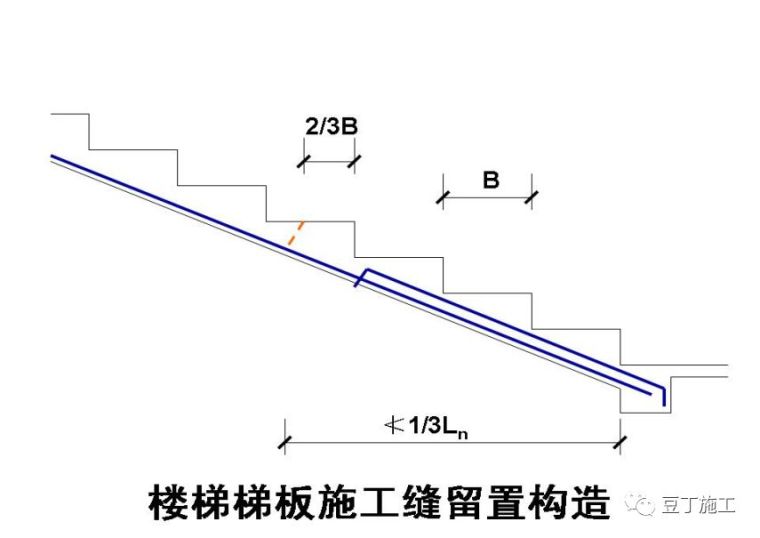 11、现浇楼梯应与主体结构同步施工,不得采用在墙体内留置水平沟槽的方式进行施工。楼梯梯板的施工缝应留置在楼梯梯板跨度中间1/3 的范围内,施工缝距相应踏步面前缘的距离为1/2~2/3的踏步宽度且支施工缝的梳子板应垂直与楼梯底板。
