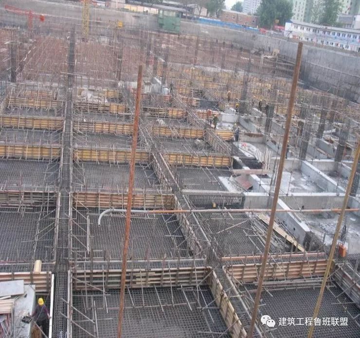 根据结构形式、工程量大小、劳动力组织情况等,将基础底板沿东西方向划分为5块,沿南北方向划分为6块,共计划分18块,每块的边长为40m左右。