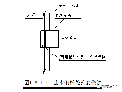 外墙常规钢筋施工钢板止水带安置钢板处柱分离箍筋焊接(见图1.6.1-1)焊短钢筋头于止水钢板上和剪力墙竖筋上绑扎双层钢丝网于钢筋头上,钢丝网放置在先浇混凝土一侧封剪力墙外模,并加固牢固后浇带两侧混凝土浇筑后浇带两侧混凝土养护。