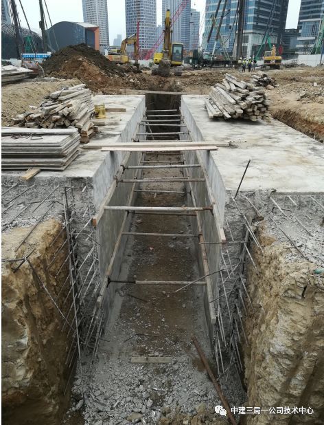 施工注意事项:①导墙分段施工缝应与地连墙接头缝错开;②导墙L型转角处应最少外延100mm;③导墙两翼缘钢筋尽量伸出一定长度与场区硬化搭接,提高导墙稳定性;④测量以控制导墙中轴线、顶标高为主。