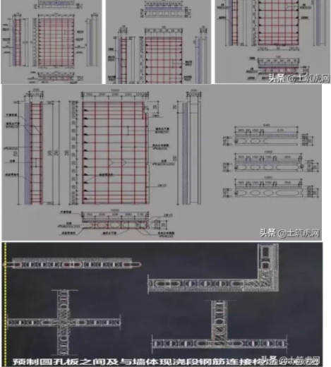 墙板由标准钢筋网片、混凝土组成(外墙增加保温),经在标准的模具内进行混凝土浇筑而成。预制墙板的上下和左右都有贯通的凹槽,中间由若干椭圆孔等距分布在板内。