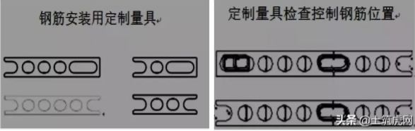 钢筋安装过程中,采用与预制圆孔板构件安装要求一致的定型定制量具对钢筋安装位置进行检验和校正,保证钢筋安装符合设计及预制圆孔板构件安装要求。钢筋测量及定制量具。