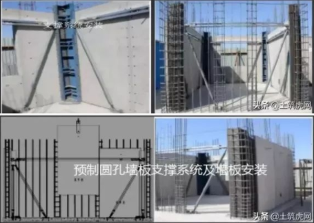 支撑系统安装:安装预制圆孔墙板构件采用EVE支撑系统。支撑系统包括定型墙模板、固定底盘、预埋螺栓、定型墙模板斜支撑、拉接横梁、预制构件拉接螺栓及螺母等。