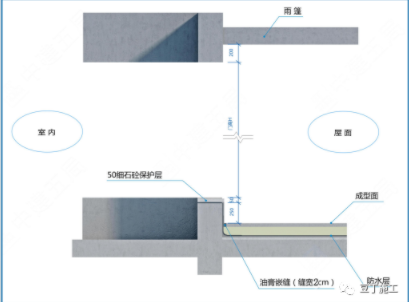 (2)女儿墙立面抹灰层应设置分隔缝,并与屋面刚性层、泛水分隔缝贯通。