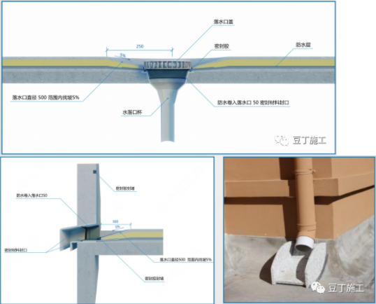 (1)水落口杯上口的标高必须设在最低处,屋面直式水落口周围半径500mm范围内坡度不应小于5%,防水层和附加层伸入水落口 杯内部不小于50mm,并应粘接牢固。水落口杯与基层接触处应留宽20mm、深20mm凹槽,嵌密封材料。