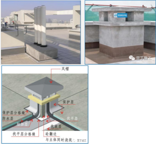 (4)排汽道纵横间距宜为6m,排汽道宽度宜为40mm;屋面面积每36㎡宜设置一个排气孔。透气孔距屋面高度大于250mm,应做防水处理。