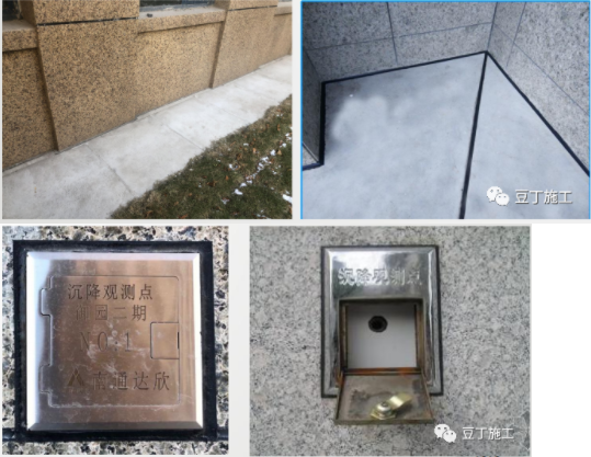(2)沉降观测点制作要精细,顶面要做成半球形,沉降观测点在同一建筑物伸出墙面距离相等;沉降观测点不得被外装饰材料 (干挂石材、铝板等)覆盖。结构墙柱、变形缝两端及建筑物转角处,每隔8~12m均匀设置一个 。