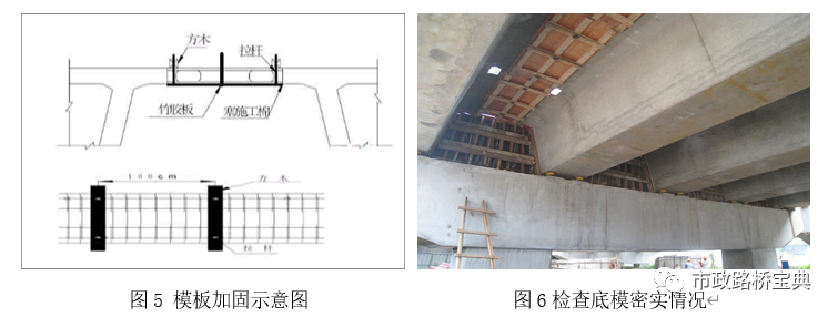 模板采用优质竹胶板,模板按纵向湿接缝宽度扩大10cm进行加工,模板固定采用螺栓带拉杆,用8#槽钢做筐,以加强竹胶板的承载能力,并用12的螺栓将底板悬吊在顶面槽钢上。拆模时松开螺栓,底板就自然下落,拆卸都十分方便,内用20PVC管以便拉筋多次倒用。