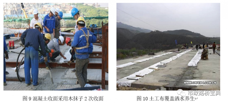 混凝土施工完毕后,即覆盖塑料薄膜,锁住水分防止早期收缩出现裂缝。2小时后出去薄膜,进行2次收面,采用木抹子收平,及时覆盖土工布并洒水养护。开始洒水时不能对着混凝土直喷,要轻洒,水流要缓慢。养生期间要派专人24小时养护,土工布一直要保持湿润,养生期间要杜绝施工车辆在铺装层上行驶或者堆放杂物,以免使铺装层混凝土受到损伤。养护不少于14天。