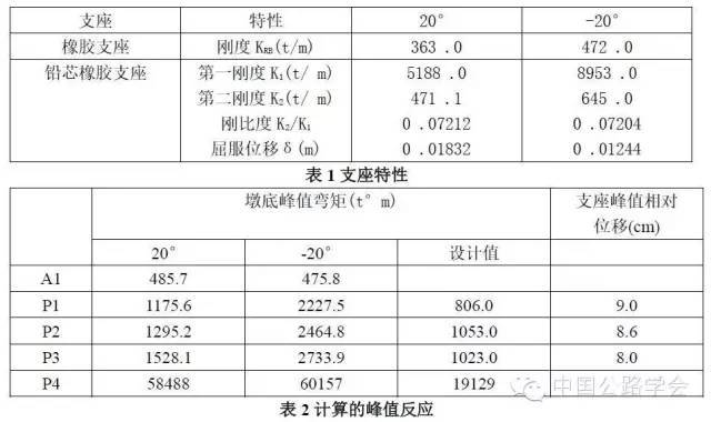 地震并没有给桥梁带来巨大破坏,仅在P4墩上发生较大位移。然而,宝贵的地震记录被用来对该新桥进行计算分析。分析时,该桥的橡胶支座使用了不同温度作用下的试验参数(见表1)。用记录到的强震记录对具有真实试验参数的On-Neton新桥进行时程分析。分析结果表明,在-20C的情况下会产生几乎比20C时几乎大一倍的墩底峰值弯矩,远大于原支座的设计参数(表2)。