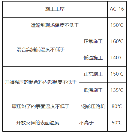 热拌沥青混合料摊铺主要采用机械摊铺。在摊铺过程,对沥青混合料温度做检测,其温度控制见下表:
