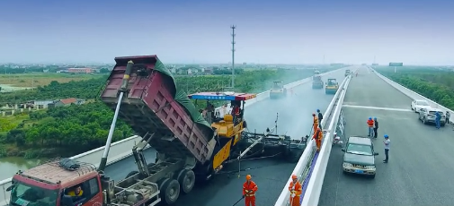 摊铺机起步后,边摊铺边推动自卸车前进,自卸车继续向摊铺受料斗中卸料。第一辆自卸车卸料完毕后立即离开摊铺机,同时第二辆自卸车向摊铺机后退,重复上述操作。