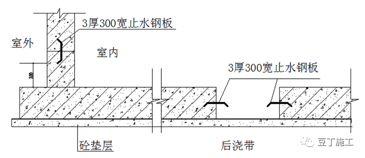 5、采用在后浇带处预留企口槽或采用预埋止水钢板和止水条的方法避免该处渗漏。