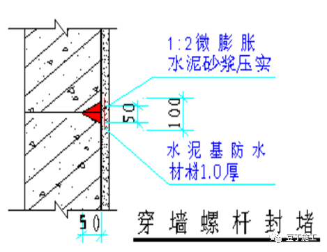 2、外接触面形成50x50左右锥形凹槽,采用微膨胀水泥防水砂浆挤压,填补密实。同时外刷100x100宽1厚JS防水涂料。