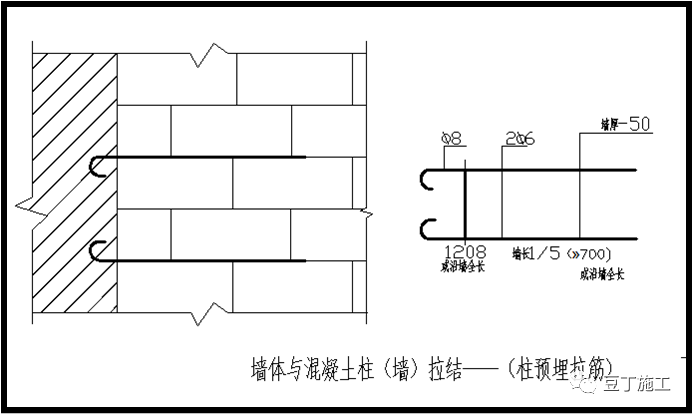 4、砖墙砌筑时沿竖向每隔不大于500mm(根据砌块的模数确定拉结筋的位置,且拉结钢筋应埋设在灰缝中)设置26拉结钢筋,钢筋两端应弯直角钩伸入墙内长度要符合设计要求。