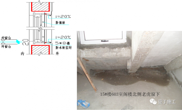 铝合金窗内外窗台高差20mm,外窗台应低于内窗台,外窗台应有20%的向外排水坡度。