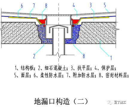 4、施工工序可参考:地漏口周边凿毛清理干净地漏口处板底安装模板地漏口周边湿润,扫水砂浆填筑细石混凝土并留出凹槽地面饰面层施工及养护铺贴地面饰面层凹槽处清理干净并干燥凹槽处嵌填防水油膏。