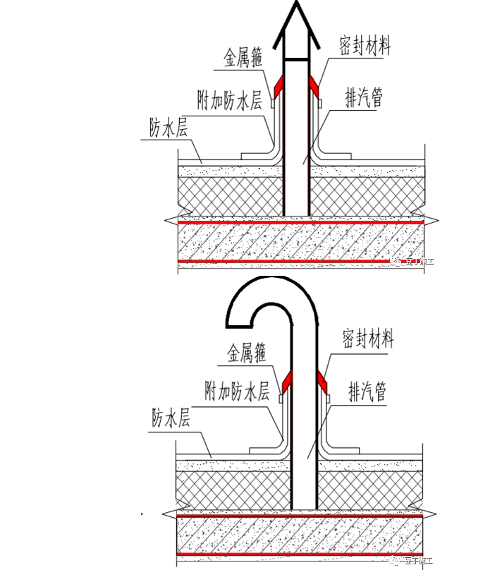2、排气管宜设置在结构层上,穿过保温层的管壁应设排汽孔,排气管应设防水处理。防水层施工前,必须检查隔热层内部是否存在水体,如发现,必须将水排干,使隔热层在防水层下部处于干燥环境。如出现漏设,必须在结构层下部钻孔排干水体,上部开孔将气体排出。