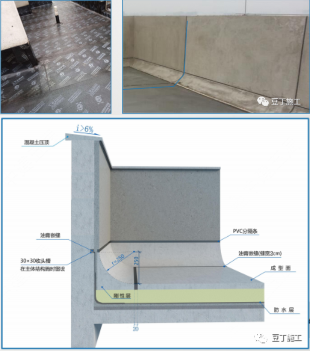 (2)不等高变形缝:在变形缝内填充不燃保温材料,在保温材料上方剪力墙植筋做悬挑板,悬挑板上方采用水泥防水砂浆或细石砼在基层进行找坡, 坡度不小于6%,悬挑下口应做滴水线或鹰嘴,滴水槽宽度和深度不小于10mm。