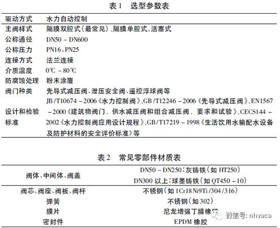 1) 水力控制阀的选型主要为主阀的选型,包括样式、口径、压力、材质等。常见的水力控制阀选型参数见表: