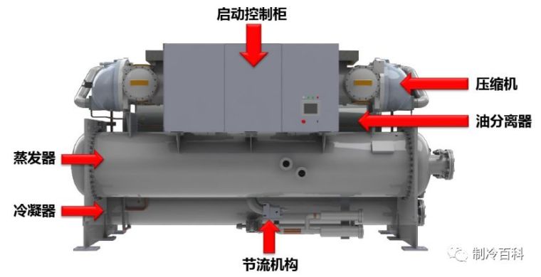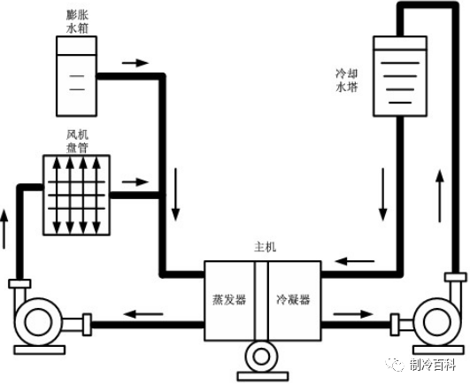 主机部分由压缩机、蒸发器、冷凝器及冷媒(制冷剂)等组成,其工作循环过程如下:首先低压气态冷媒被压缩机加压进入冷凝器并逐渐冷凝成高压液体。在冷凝过程中冷媒会释放出大量热能,这部分热能被冷凝器中的冷却水吸收并送到室外的冷却塔上,最终释放到大气中去。