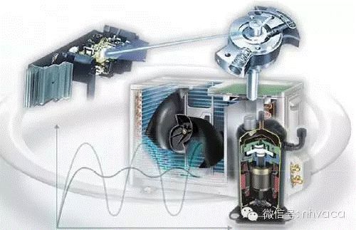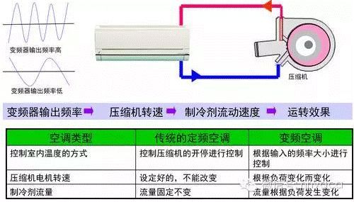 变频空调的压缩机由变频电机拖动,变频器输出频率变化的交流电给电动机,使电动机的转速可以根据室内制冷量的需要而连续变化,最终压缩机的制冷量达到连续变化的自动控制。