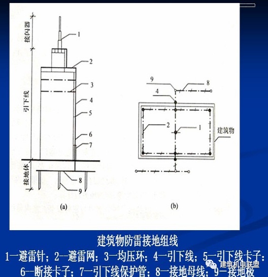 接地装置有接地母线、接地极组成,目前建筑物接地极利用建筑物基础内的钢筋作接地极,接地母线是从断接卡子处引出钢筋或扁钢预留,备用补打接地极用。