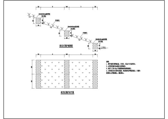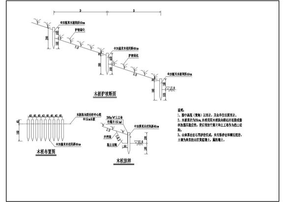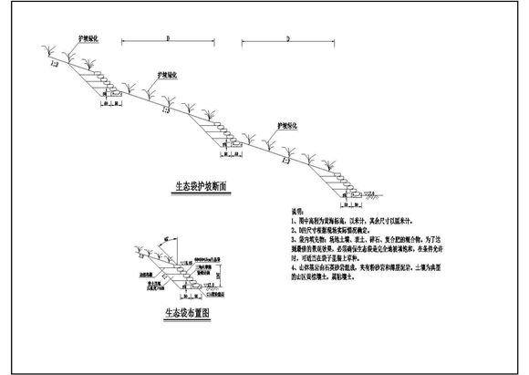 本图为三种生态护坡断面图,共3张。分别为宾格网护坡图、生态袋护坡图、木桩护坡图。3种剖面均比较典型。适合广大设计人员边坡支护参考。
