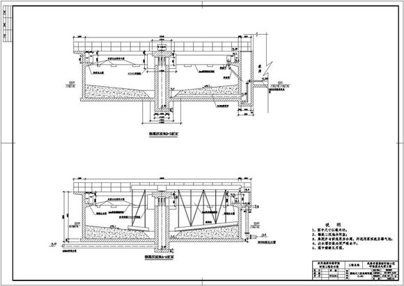 某印染小区印染废水处理工程辐流式二沉池平面图、剖面图、设备清单及图纸说明,图纸刮吸泥机为半桥式周边传动刮吸泥机。