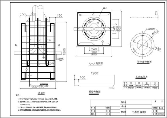 某900*900*1500mm15米灯杆基础结构施工图,只有一张图纸,有说明,基础图,剖面图,螺栓大样图,法兰盘大样图,基础配筋图。