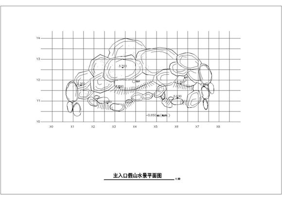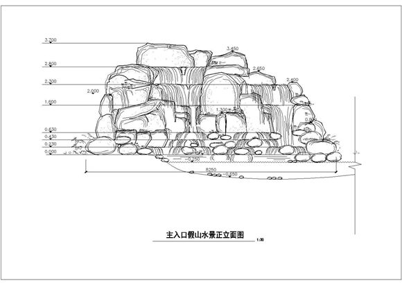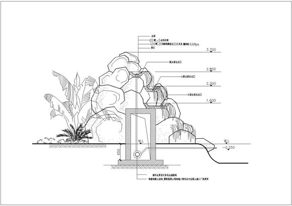 园林叠石流水假山景观做法施工图纸,适合小区、公园用的流水假山做法,包含平面、立面、剖面及结构做法。