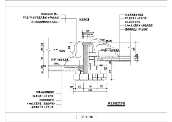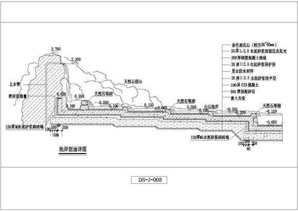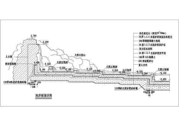 多个跌水水景以及胡泊河岸驳岸剖面做法,可供参考学习。补充说明:驳岸做法为常规做法,标注清晰,适合初学者参考学习。