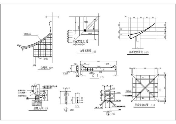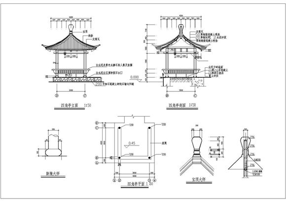中国传统风格四角亭方案,图纸包括了四角亭正面图、立面图、剖面、大样图及结构布置图,供下载参考。