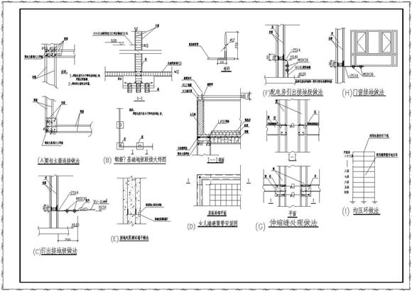 某工程的梁柱主筋连接做法,钢筋砼基础地极联接大样图,引出接地极做法,女儿墙避雷带安装图,接地电阻测试端子做法,配电房引出接地极做法,伸缩缝处理做法,均压环做法等