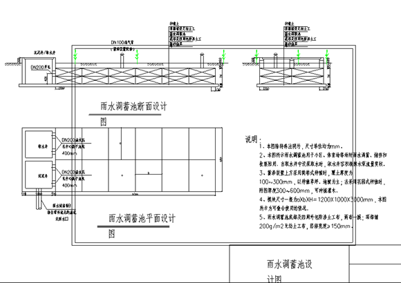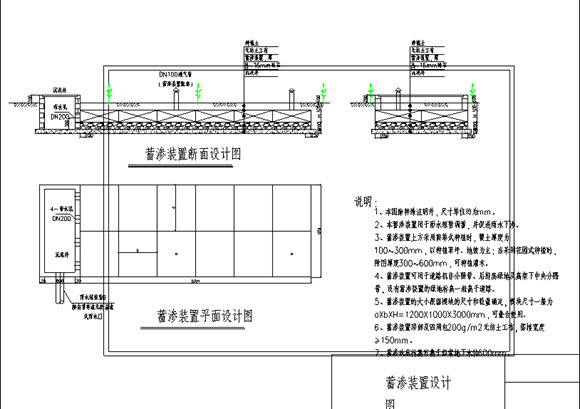 本图纸为蓄渗装置、雨水调蓄池设计图,包括蓄渗装置断面设计图、蓄渗装置平面设计图、雨水调蓄池断面设计图等,可供参考。