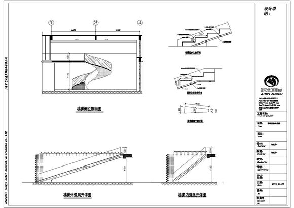 本工程为某地区的钢结构旋转楼梯布置图,包含楼梯一层平面详图、楼梯侧立剖面图、楼梯外弧展开详图,图纸内容完整,表达清晰,制图严谨,欢迎设计师下载使用