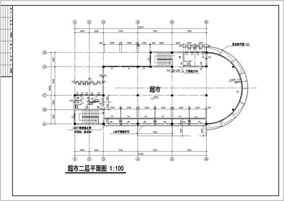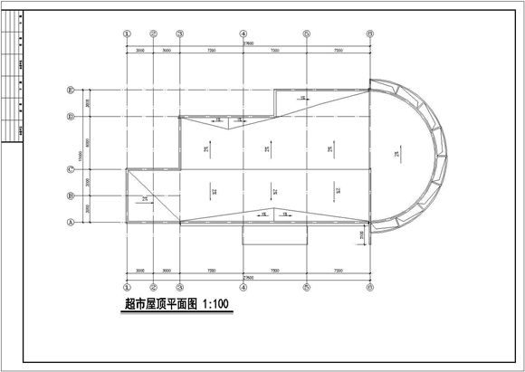 本图纸为某地区小型超市建筑设计图(共7张),其内容包括:超市屋顶平面图、超市二层平面图、剖面详图等。内容详实,可供参考。